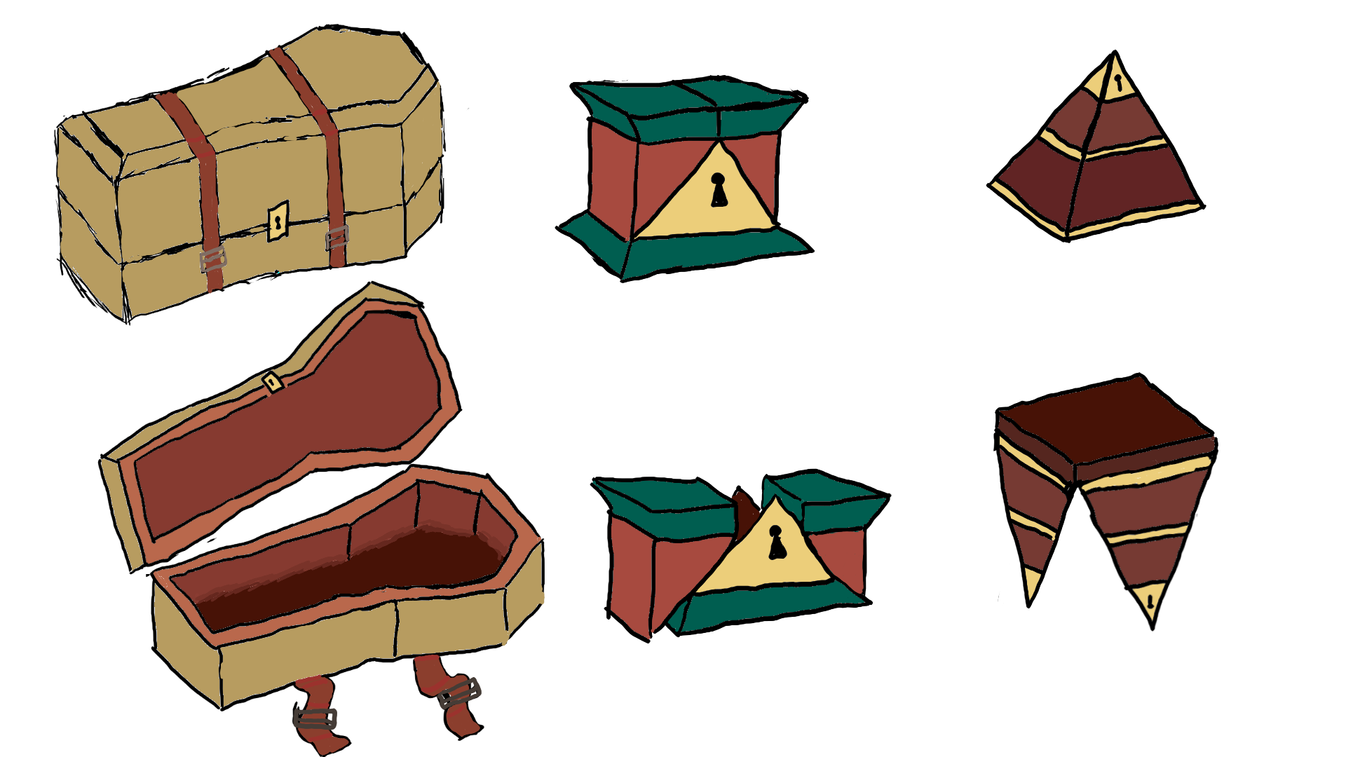 A trio of treasure chests meant to evoke the inside of a pyramid. Each opens in a different style, the leftmost one having a lid that folds up, the center one having the lid split in two to fall away at either side, and the rightmost one being meant to pop up and serve as a table when opened with each of the four sides becoming table legs.