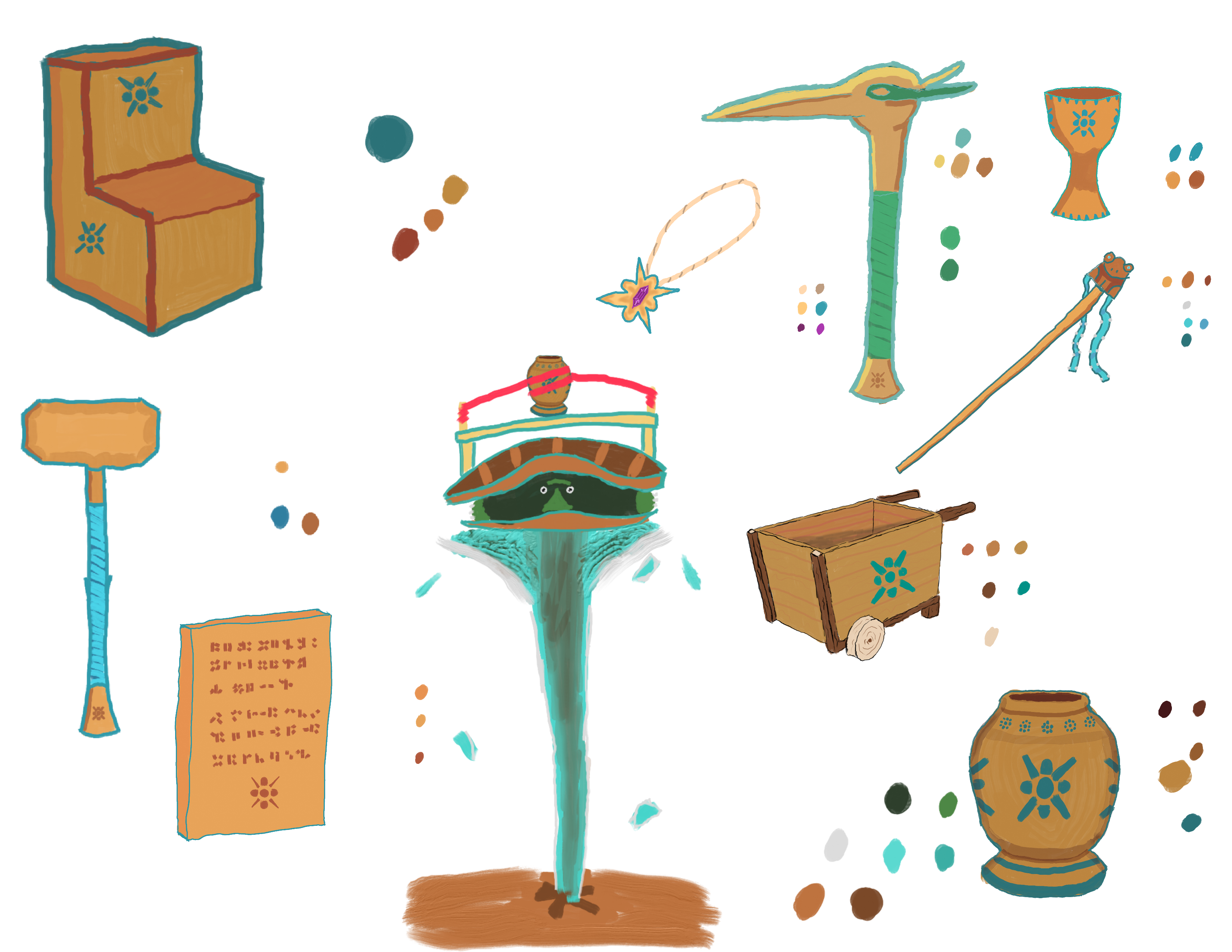 A number of tools and props that were designed for a fantasy setting with an early tribal culture living inside of a canyon. Materials are transported up the walls of cliffs on the backs of giant turtles by using natural geysers, as pictured in the center of the concept art.